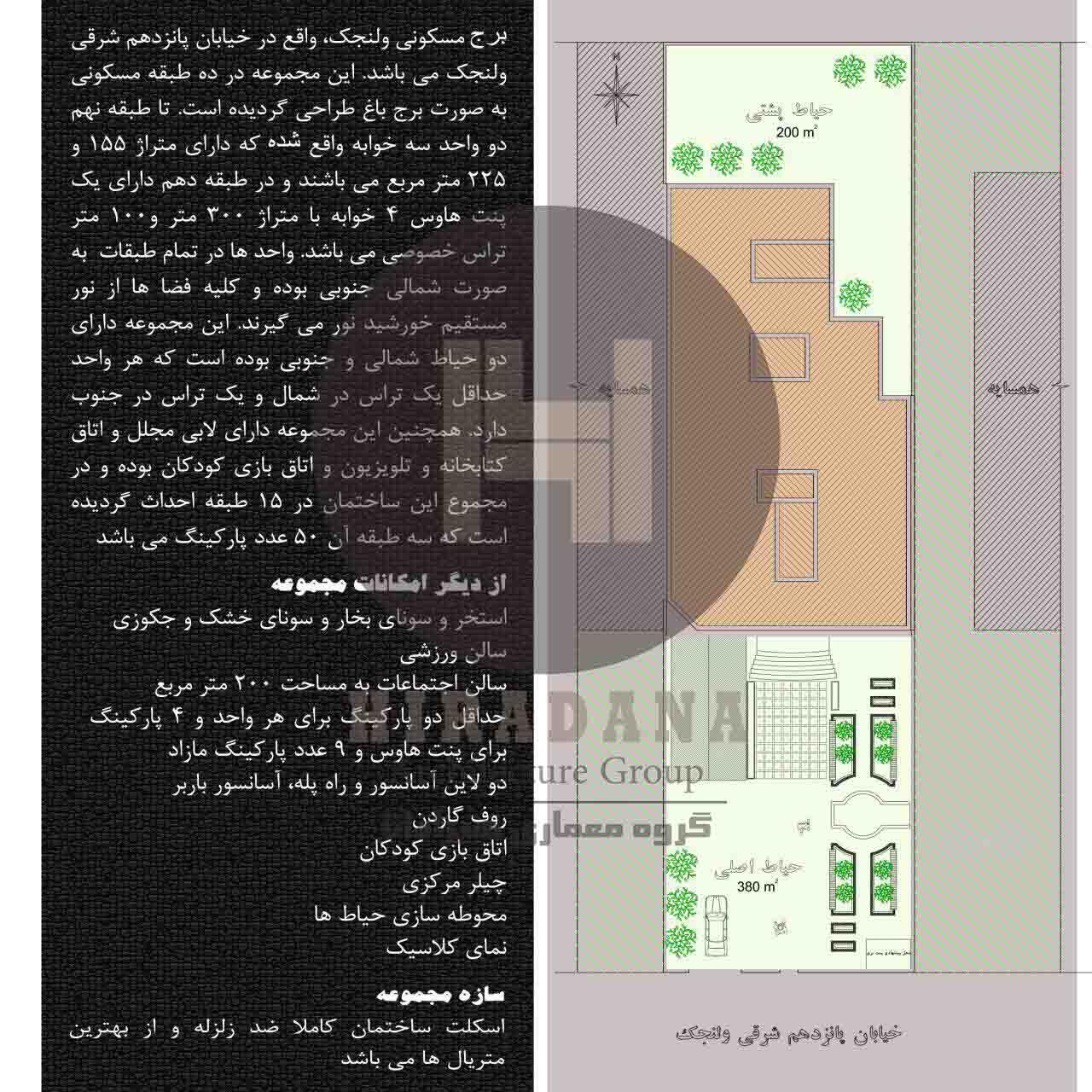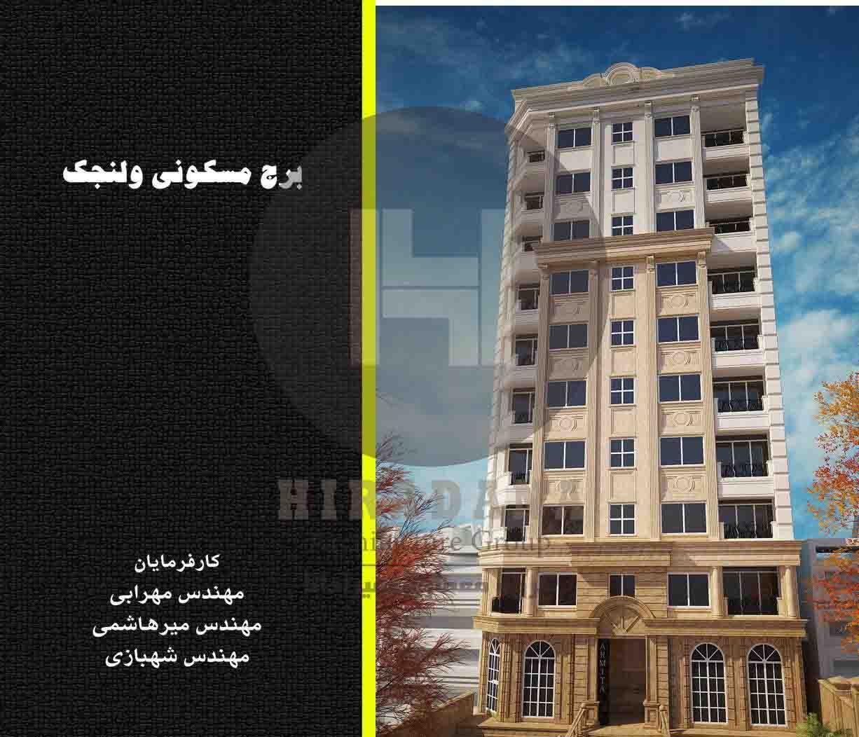 برج مسکونی ولنجک در خیابان 15 ام شرقی ولنجک میباشد ، که در ده طیقه مسکونی در قالب برج باغ طراحی دکوراسیون شده است . تمامی واحد های این برج به صورت شمالی جنوبی طراحی شده اند که نور مستقیم خورشید شامل تمامی آنها میشود و حیاط ها نیز به صورت شمالی جنوبی میباشند و هر واحد حداقل یک تراس در شمال و یکی در جنوب دارند . از دیگر خدماتی که که در طراحی دکوراسیون این برج پیش بینی شده است ، اتاق تلویزیون و کتابخانه ، اتاق بازی کودکان و یک لابی مجلل همراه با دکوراسیون کلاسیک میباشد .