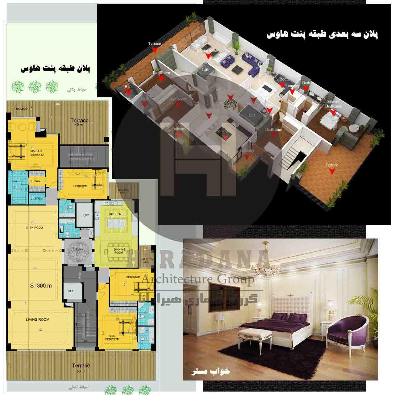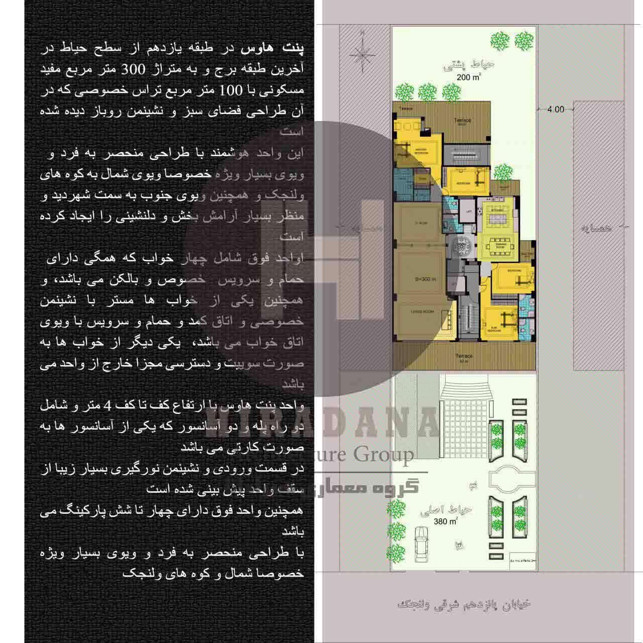 پنت هاوس در طبقه یازدهم برج به متراژ 300 متر مربع مفید مسکونی و 100 متر مربع تراس خصوصی با طراحی فضای سبز و نشیمن روباز میباشد .