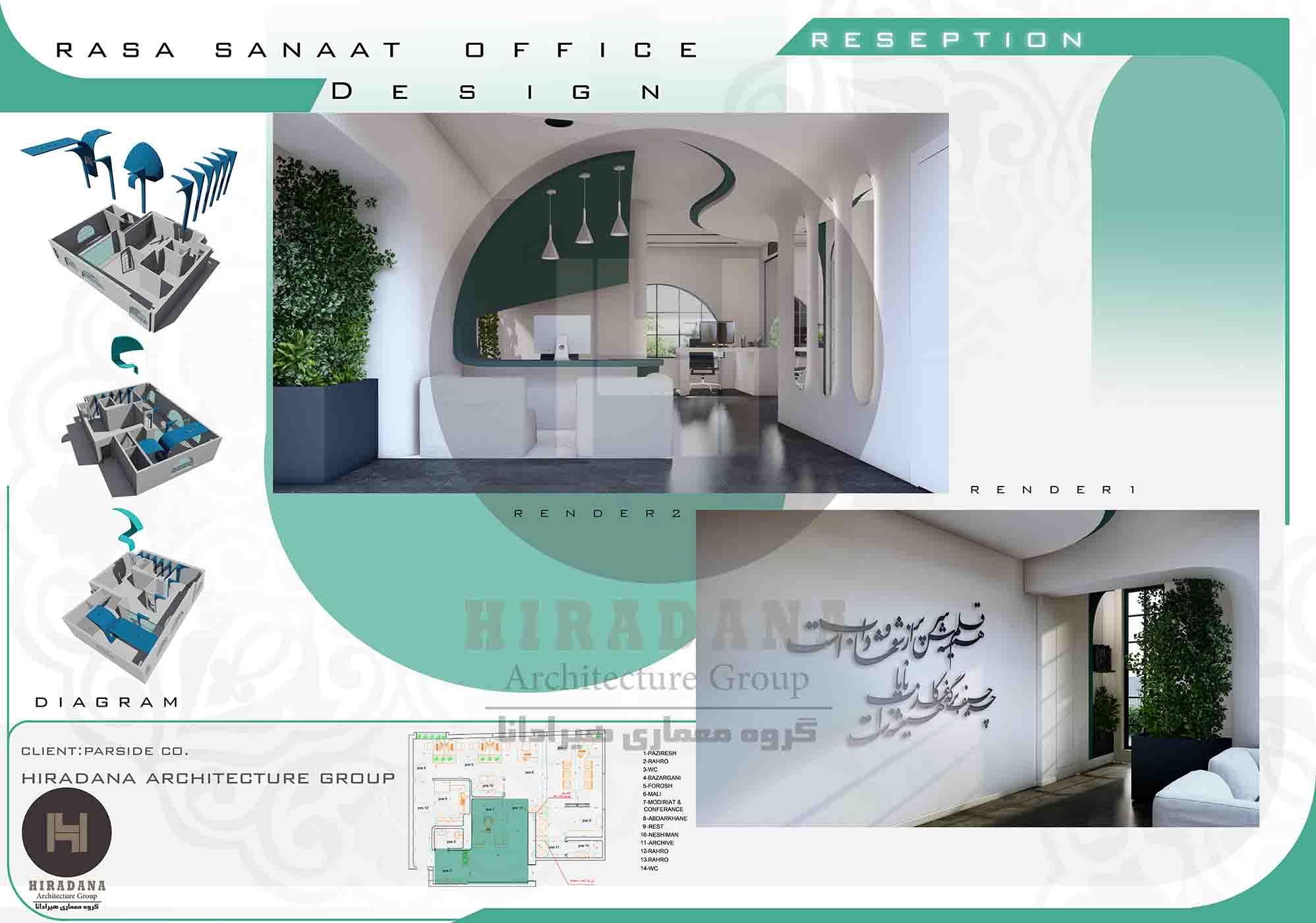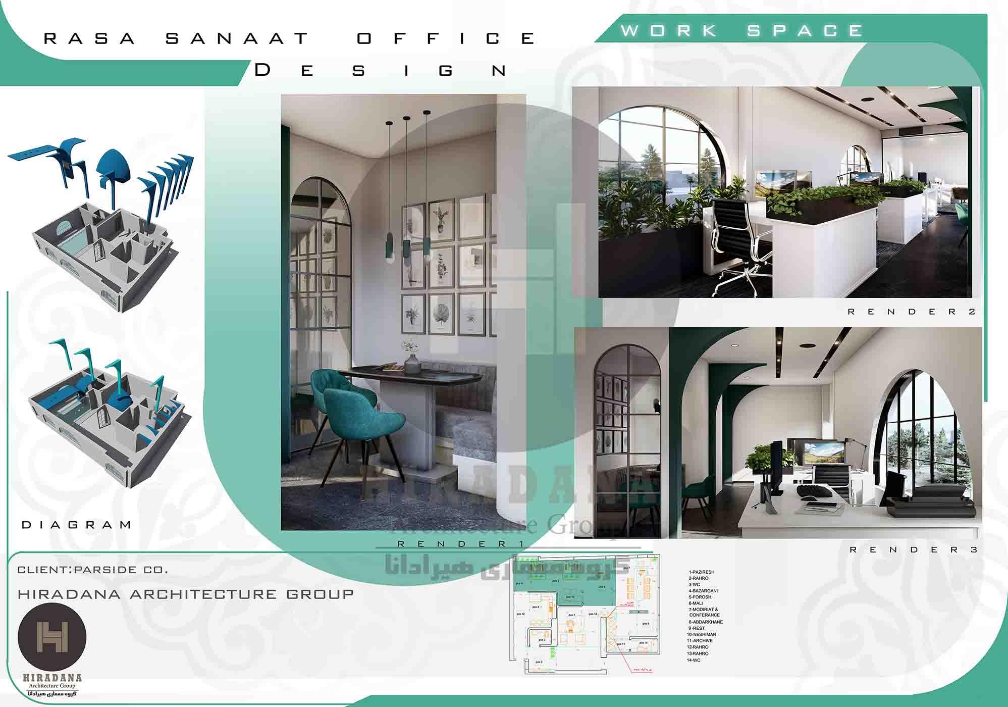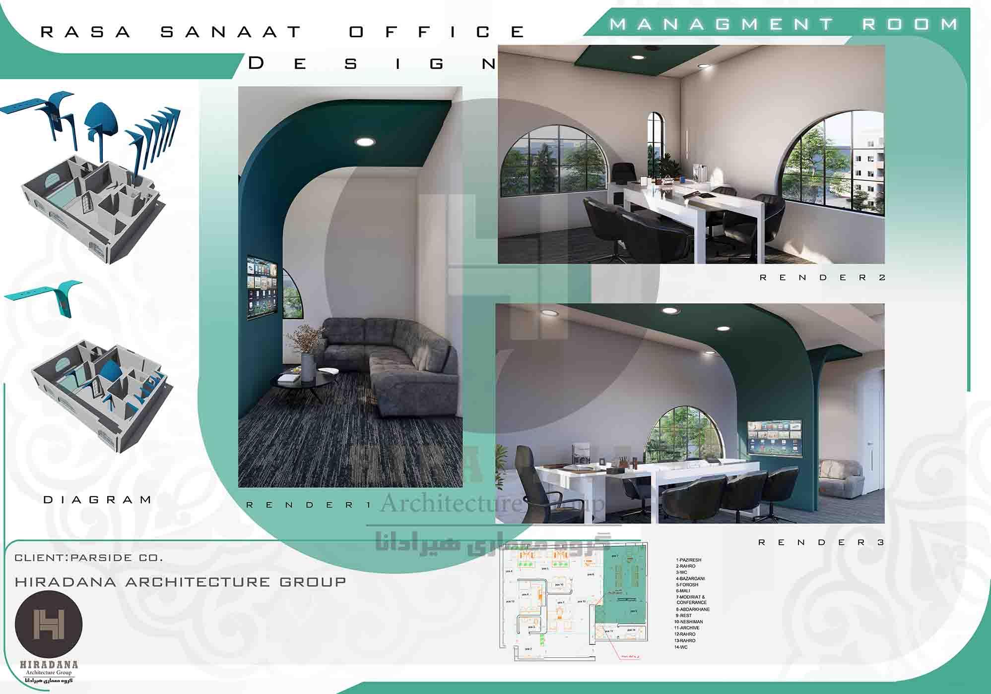 فضا های این دکوراسیون اداری به صورت اپن افیس پیش بینی شده و کانسپت طراحی این پروژه با توجه به اینکه زمینه ی فعالیت شرکت راسا صنعت در زمینه ی کاغذ می باشد از اریگومی کاغذ الهام گرفتیم که در بخش های مختلف این پروژه میتوانید مشاهده کنید . از فرم فضای منشی گرفته تا قسمت مدیریت و همینطور نیم قوس های ایرانی که فضاهای حرکتی ما را شکل دادن همینطور فرم و دسترسی مناسب بازشوهای این پروژه . شرکت معماری هیرادانا در نهایت ظرف مدت زمان 3 ماه به صورت کامل و فرنیش شده این پروژه را تقدیم مهندس اژدری با رضایت کامل نمود .